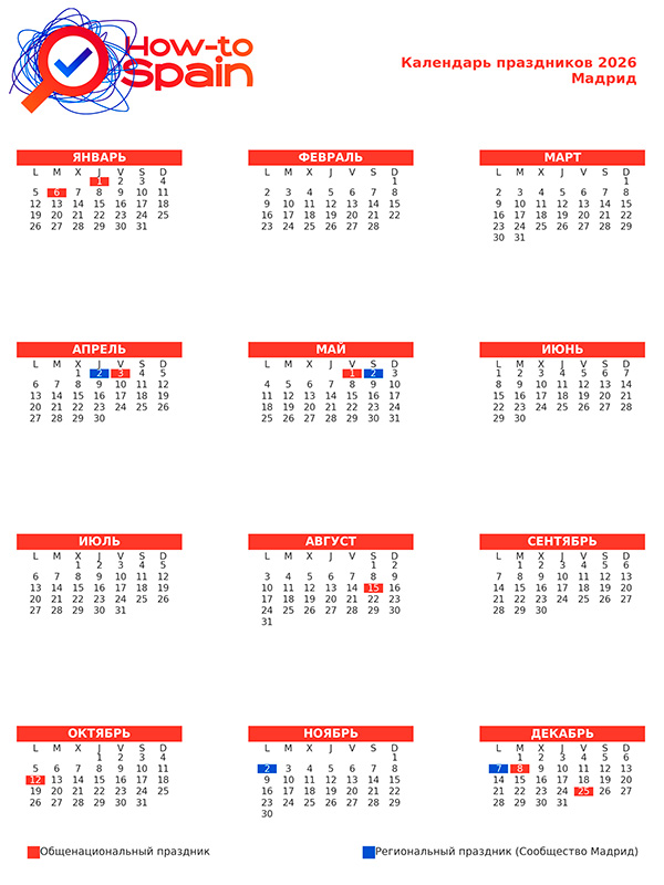 Скачайте календарь выходных дней и праздников в Мадриде в 2026 году